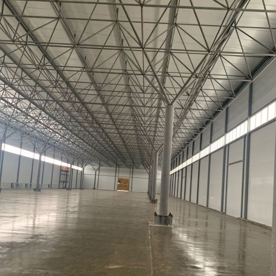 Под нужды заказчика была разработана и установлена ПСПК(перекрёстно-стержневая пространственная конструкция). Размеры здания составили 120*30*8(3600 кв/м).